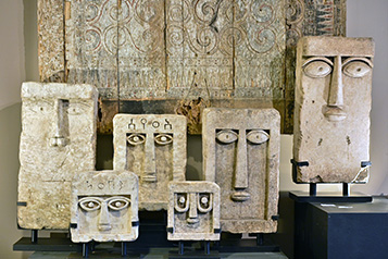 Sculptées à la main, en pierre de sable par nos artisans, ces stèles étaient à l’origine des piliers. De formes rectangulaires, à l’effigie de visages stylisés, elles étaient gravées parfois du nom de leurs propriétaires. Ces visages toujours représentés de face avec un nez droit, surmonté d’arcades sourcilières en fort relief, étaient encadrées d’yeux en forme d’amande et d’une petite bouche aux lèvres pincées.