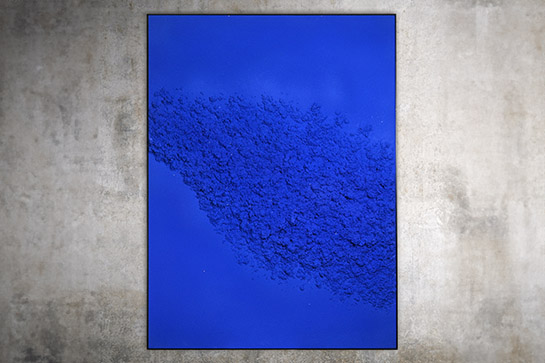 On aime et on assume pleinement le Bleu Klein de ce tableau contemporain qui joue sur le relief, la texture et la lumière. Œuvre ou paysage fantastique ? Azur immense de la voie lactée ou îlot flottant dans une mer bleue vu du ciel ? Quoiqu'il en soit, des étoiles semblent scintiller comme une constellation. Alors, profondeur ou altitude ? Nous vous laissons le choix de rêver !